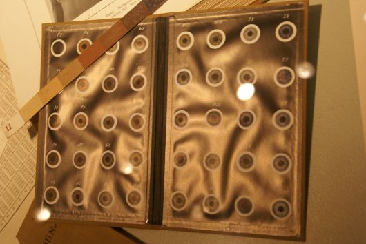Ook kleuren van ogen werden voor de metingen opgenomen en met dit soort van oog-kleurenkaarten ingedeeld. Foto: in de vitrine bij het Tropenmuseum.