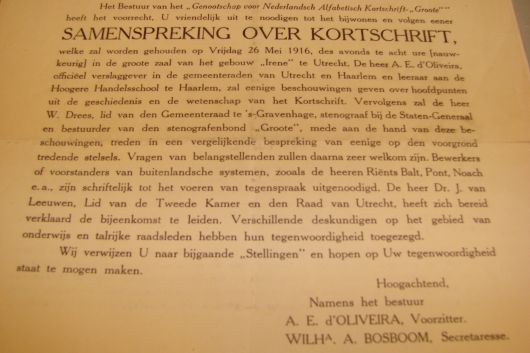 26 mei 1916. Samenspreking waarbij het systeem Groote door Willem Drees verdedigd zal worden. In die tijd was er nog geen algemeen gehanteerde stenografie. Verschillende systemen werden in wedstrijdvorm met elkaar gemeten!