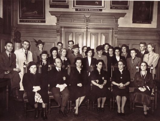 Elsa's promotie, 18 september 1942. Zij was de laatse joodse vrouw die in Amsterdam promoveerde. Op de foto haar ouders, stiefmoeder, broer en vriendinnen, waaronder Cor van Twisk, Hanny Ledeboer en Mary Vaz Dias. De receptie erna, was niet openbaar.