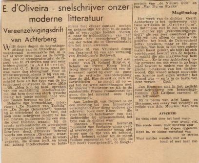 "De ‘jonge d’Oliveira’ (ter onderscheiding van oudere Eli) zat bij de eerste zes reporters (was toen 14 jaar, hbs’er). Ontmoette hem voor het eerst toen hij in Steeds Sneller in café Lohengrin op het Rembrandtsplein les gaf ‘aan een ander jong baasje’. Behoorde tot het mij sympathieke clubje jonge Groote-schrijvers die voor het stelsel streden. Was een goede bekende bij mij aan huis, logeerde voor zijn vertrek bij mij in Bussum."
