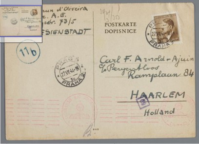 Eén van de meest ontroerende vondsten zijn de briefkaarten uit Theresiënstadt, die we op internet(!) vonden bij het Joods Historisch Museum . Een aantal briefkaarten uit Theresienstadt, gestuurd door onze grootvader Eli d'Oliveira.